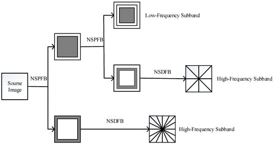 Overall, this transform method is a multiscale, multidirectional image processing algorithm with translation invariance based on the NSPFB and NSDFB. Initially, the NSPFB decomposes an input image into high-pass and low-pass sub-bands, which are then further decomposed directionally by the NSDFB into multiple high-frequency directional sub-bands. The low-frequency part undergoes similar decomposition, and a second-level NSCT decomposition is illustrated in