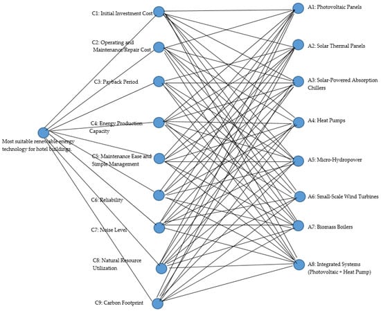 The primary goal of the decision-making process is to determine the most suitable renewable energy technology for hotel buildings. The decision problem is structured into a hierarchical model with three levels: