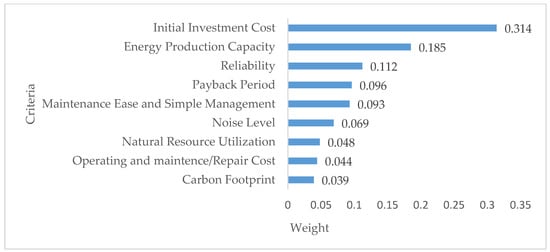 Using the AHP method, the relative importance weights of criteria for decision-making in renewable energy technologies are as follows: initial investment cost (0.314), energy production capacity (0.185), reliability (0.112), payback period (0.096), maintenance ease and simple management (0.093), noise level (0.069), natural resource utilization (0.048), operating and maintenance/repair cost (0.044), and carbon footprint (0.039).