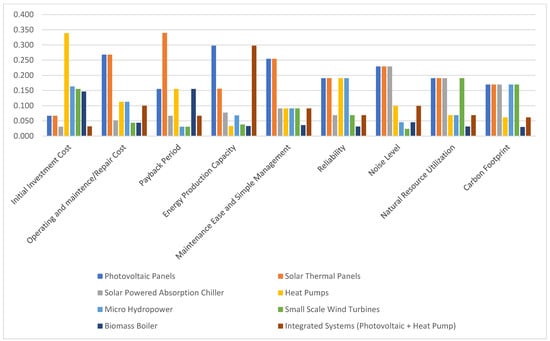 The alternatives are ranked based on their overall priority as follows: photovoltaic panels, heat pumps, solar thermal panels, micro-hydropower, integrated systems, small-scale wind turbines, biomass boilers, and solar-powered absorption chillers (Table 10).