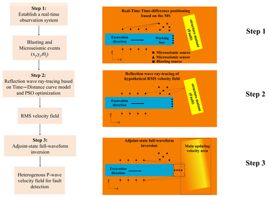 To solve the above issue, this paper proposes a velocity field inversion method based on an MS, which simultaneously utilizing information from active and passive seismic sources to achieve the real-time updating of the velocity field in the monitoring area for fault detection. Firstly, we derive the equation for the non-linear microseismic source reflection wave travel time curve based on reflected wave ray-tracing theory, and establish the RMS (Root Mean Square) velocity field inversion method based on PSO to establish an initial velocity field that can describe preliminary fault information. Secondly, we propose an adjoint-state full-waveform inversion method using the updated blasting source and RMS velocity field to update the heterogenous P-wave velocity model for fault detection. Finally, a classical numerical study based on an actual MS detection situation is used to test the accuracy of the proposed velocity inversion method when used in fault detection.