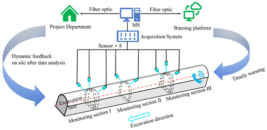 During tunnel excavation, the MS is deployed between the tunnel crown and the sidewalls with two or three monitoring surfaces for real-time microseismic monitoring. The MS equipment mainly includes microseismic sensors, data acquisition units, microseismic monitoring servers, and other supporting devices. The typical layout of the MS in the tunnels during the drilling and blasting method is shown in Figure 2. A set of acquisition equipment contains eight uniaxial sensors, typically covering an area of 40–120 m behind the tunnel face, which advances as the tunnel face progresses. The sensors monitor the information of active and passive seismic sources in real time and upload it through a fiber optic ring network to the project department and the early warning cloud for real-time data analysis and the timely release of warning information. We hope to master the current and future states of unfavorable geological bodies using blasting and rock fracture information monitored by the MS.