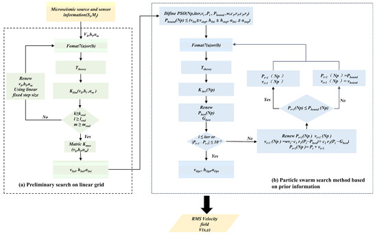 It is important to note that conventional methods for analyzing a travel-time curve RMS velocity field have often relied on simple grid searches. However, optimization algorithms can be limited in multi-extremum inversions. In this study, we considered the advantages of PSO in updating search directions nonlinearly. We adopted a PSO-based parameter inversion approach with passive seismic information that incorporates prior information from grid searches. By determining the optimal values of K from theoretical inversions, we established the inversion process for establishing the RMS velocity field, as depicted in Figure 4.