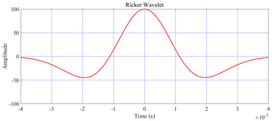 We first establish a common tunnel microseismic observation system in the xy-plane. It simulates multiple random fracture seismic sources within the monitoring range based on the two-dimensional time-domain elastic equations. Furthermore, convolutional perfectly matched layer (CPML) boundaries were defined at the calculation domain’s boundaries [30], and an absorbing edge boundary (AEA) was defined in the Excavation Damaged Zone (EDZ) region to better reflect the wave field’s propagation characteristics [31]. The elastic wave equation used in this paper is shown in Equation (18) [32], and the source wavelet employed was a Ricker wavelet with a dominant frequency fm of 200 Hz, as shown in Figure 5.