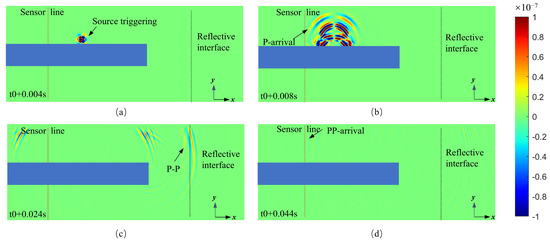 Wavefield snapshot of the seismic source propagation process at different times based on the MS (a) t = 0.004 s, (b) t = 0.008 s, (c) t = 0.024 s and (d) t = 0.044 s.