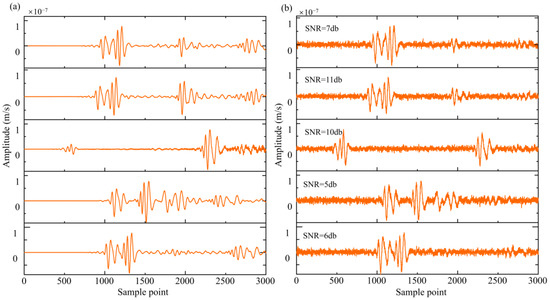 Waveform diagram of microseismic waves received by the same sensor: (a) extract wavefield data before adding noise; (b) extract wavefield data after adding noise.
