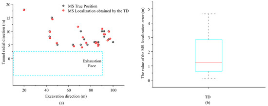 Seismic source localization result from the TD: (a) localization distribution map before and after seismic source localization; (b) error box-plot for the true MS position and MS localization position obtained from the TD.