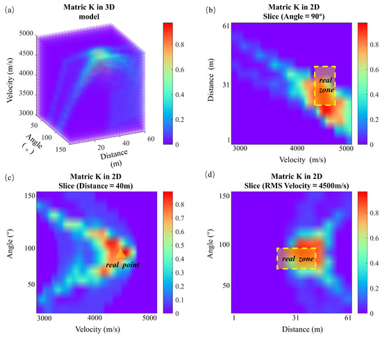 Preliminary linear search results for velocity field parameters based on the travel-time curve model: (a) Matric K result in a 3D perspective. (b) Matric K result in a 2D slice perspective (α = 90°). (c) Matric K result in a 2D slice perspective (h = 45 m). (d) Matric K result in a 2D slice perspective (v = 4500 m/s).