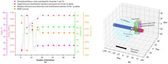 The overall workflow of fault detection in a deep tunnel based on an MS using an updating heterogeneous velocity model in this article is constructed around three main objectives, as illustrated in Figure 1. Firstly, the establishment of a real-time observation system is targeted. During excavation, the MS achieves the continuous monitoring of active and passive seismic source information. Secondly, a theoretical equation of the propagation paths of passive seismic sources through inclined faults called the time–distance curve equation is proposed based on the reflection wave ray-tracing method, which can be used to calculate the theoretical travel time of a primary reflection wave when it arrives. Furthermore, based on PSO algorithms and waveform cross-correlation principles, we can find the correct arrival time of reflected waves and establish the RMS velocity field. Thirdly, based on this RMS velocity field and in conjunction with blasting sources from tunnel face excavation, the heterogenous P-wave velocity model for fault detection in the observation area is updated using adjoint-state full-waveform inversion.