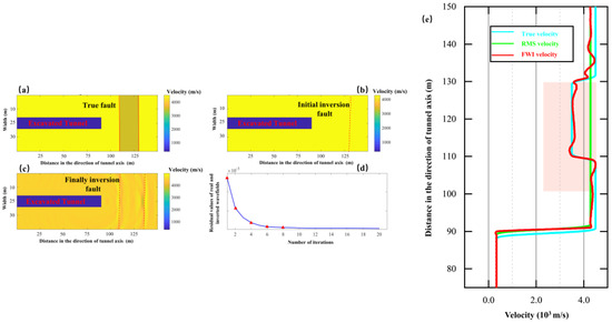Full waveform inversion results for the rectangular fault structure: (a) true velocity model; (b) RMS velocity model; (c) FWI velocity model; (d) residual value; (e) velocity model along the tunnel axis.