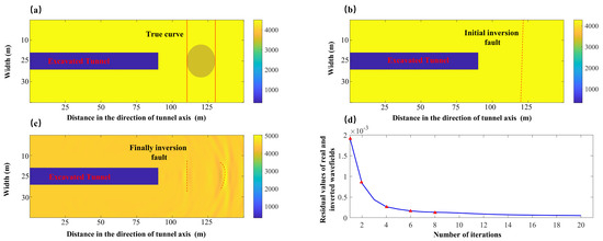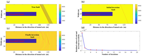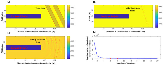 From the final results, we can see that based on the method proposed in Section 2.2, there was a certain deviation in the RMS velocity field. For example, the relative position between the current working face and the fault should be 20–40 m, while the final inversion value was around 44 m. This was because, using the method in Section 2.2, we only approximated the theoretical propagation path of the seismic source using the reflection wave ray-tracing method, and the location of the source was also inaccurate. This method provided us with initial fault information (more precisely, the location information of the fault, not the thickness information) and solved the cycle-skipping phenomenon in FWI. As mentioned earlier, for the blasting source of the excavation face, the actual time and location of the source can be approximately recorded. To obtain more accurate velocity field information, it is necessary to perform full waveform gradient correction based on this RMS velocity field.