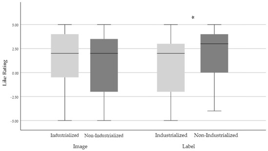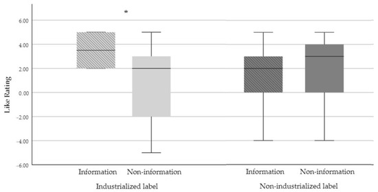 Graph of Like Rating levels according to the type of label and whether or not the information was received. The shaded patterns indicate different conditions: diagonal stripes represent the ‘Information’ condition, and solid gray represents the ‘Non-information’ condition. * Indicates statistically significant differences (p < 0.05).