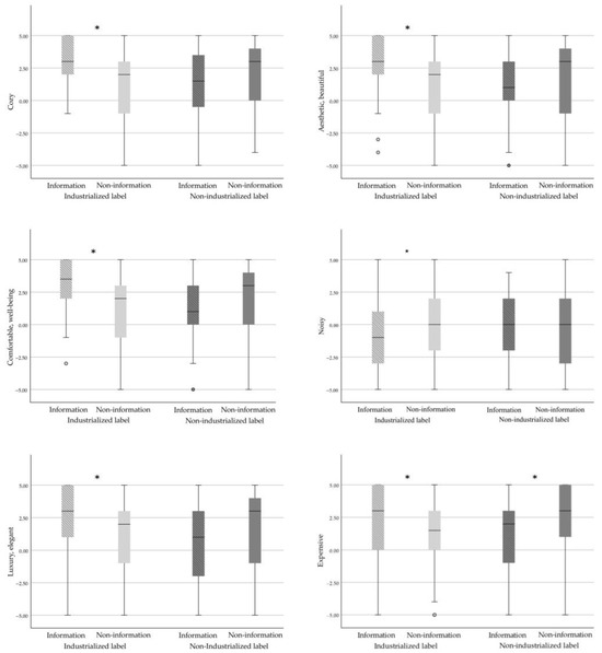 Graph of the specific ratings of dwellings (Cozy; Aesthetic, Beautiful; Comfortable, well-being; Noisy; Luxury, elegant; Expensive) according to the type of label and whether they have received information. The asterisk (*) indicates statistically significant differences (p < 0.05). The different shading patterns represent distinct experimental conditions: diagonal stripes indicate the ‘Information’ condition, solid gray represents the ‘Non-information’ condition. The circles represent outliers in the data.
