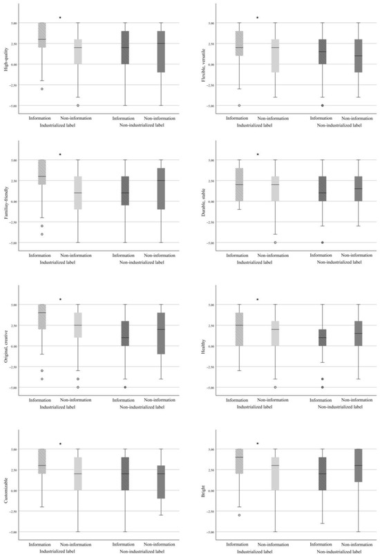 Graph of the specific ratings of dwellings (High-quality; Flexible, versatile; Family-friendly; Durable, stable; Original, creative; Healthy; Customizable; Bright) according to the type of label and whether they have received information. The asterisk (*) indicates statistically significant differences (p < 0.05). The different shading patterns represent distinct experimental conditions: diagonal stripes indicate the ‘Information’ condition, solid gray represents the ‘Non-information’ condition. The circles represent outliers in the data.