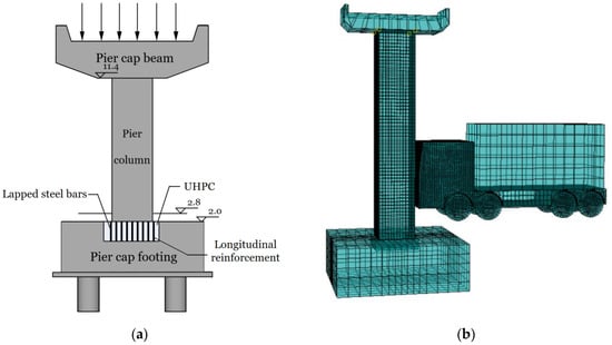 The collision contact type between the vehicle and the bridge pier was defined as surface-to-surface contact, with the impact point located 1.8 m above the road surface. Tangential behavior between the vehicle and the bridge pier contact surfaces was modeled using penalty functions with a friction coefficient of 0.3 [], while normal behavior was treated as hard contact, allowing separation after contact. When conducting analyses on different impact velocities and bridge pier design parameters, the vehicle–pier collision location consistently involved a frontal collision with zero eccentricity. The vehicle finite element model was established by defining surface-to-surface contacts between various components of the vehicle model. The impact velocity of the vehicle was achieved by altering the vehicle’s horizontal translational velocity. The cab and body were partitioned using quadrilateral mesh elements, while solid elements including the engine and cargo were partitioned using hexahedral mesh elements. The contact area was meshed finely. The simplified numerical model of the vehicle–bridge pier interaction is illustrated in Figure 2.