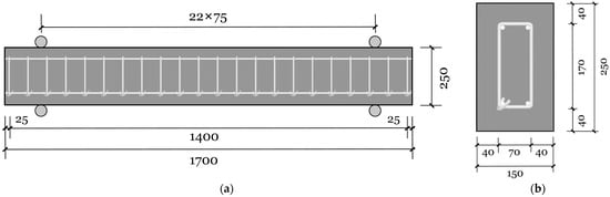 Specimen dimensions and reinforcement (unit: mm). (a) Front view; (b) cross-section view.