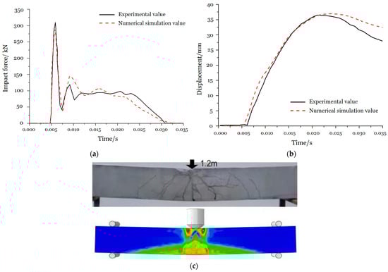 Experimental values and numerical simulation. (a) Impact force time-history curve, (b) displacement time-history curve, and (c) comparison between impact test and numerical simulation on failure modes.