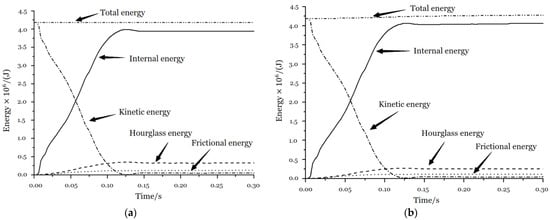 Due to the use of reduced integration in solid elements in this study, hourglass effects may occur, causing some elements to undergo deformation while the calculated stress remains zero. Obviously, such results are invalid. Therefore, it was essential to control the occurrence of hourglass effects during computation. This was achieved by refining the mesh, setting hourglass controls, or changing the element type to minimize the impact. The percentage of hourglass energy in this study did not exceed 10% of the internal energy and total energy, indicating effective control of hourglass energy during simulation. This further validates the effectiveness of the numerical simulation in this study [,].