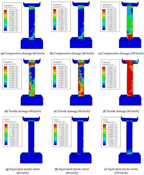 Figure 7 illustrates the damage conditions of the tenon joint pier after collision with a loaded truck at different speeds. It can be observed that the vehicle speed significantly affected the damage to the pier column. From the analysis of damage factors and equivalent plastic strain values, it is evident that the higher the vehicle speed, the more severe the damage to the pier. When the vehicle collided with the pier, a significant local compressive stress was generated at the contact surface, with substantial tensile stress appearing on the backside of the pier column at the contact surface. As the vehicle speed increased, the damage range of the pier column expanded accordingly. Due to the restraint effect of the pier cap footing and pier cap beam on the pier column, significant damage accumulated at the sections of the column base and top, particularly noticeable at the connection between the bottom of the pier column and the pier cap footing, where significant shear deformation of the concrete occurred.