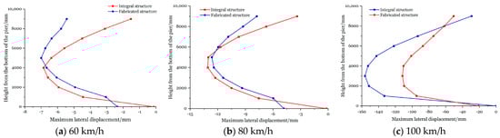The length of the overlapping reinforcement directly affects the connection effectiveness of adjacent prefabricated components. UHPC can ensure reliable connections between prefabricated segments even with shorter reinforcement overlap lengths. Figure 10 illustrates the impact response of piers under different reinforcement overlap lengths, taking a vehicle speed of 100 km/h as an example, where d represents the diameter of the overlapping reinforcement between the pier column and the pier cap footing. It can be observed from the figure that when the overlap length was small, the maximum displacement of the pier body was significantly higher than the corresponding value when the overlap length was 7.5d or above. Especially at the bottom of the pier, excessive deformation occurred, indicating that an insufficient length of reinforcement overlap can lead to unreliable connections between adjacent components and poor stress transmission between the grouting material and the overlapping reinforcement. When stress was transmitted to the grouting material, it resulted in a significant accumulation of plastic damage at the pier bottom, greatly increasing the probability of failure in the connection between the pier column and the embedded reinforcement in the pier cap footing. Excessively short reinforcement overlap segments also caused excessive local stress in the grouting material and the pier cap footing groove, indicating that insufficient overlap length can cause severe damage to the grouting material and the pier cap footing, affecting overall safety and making it difficult to repair. There was a positive correlation between the peak impact force and the reinforcement overlap length, indicating that a reasonable reinforcement overlap length can ensure good impact resistance for prefabricated piers.