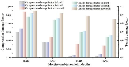 At different mortise-and-tenon joint depths, the local stress generated by the same kinetic energy on unit area grouting material varied, with smaller joint depths leading to easier grouting material damage. Despite this, UHPC grouting material did not exhibit significant damage under various vehicle impact speeds. However, the pier cap footing grooves suffered varying degrees of damage to their walls and bottoms after bearing the stress transmitted by the pier column. Figure 9 compares the damage factors of the pier cap footings and grooves under different mortise-and-tenon joint depths and vehicle impact conditions. It can be observed that under different collision speeds, the compressive and tensile damage to the concrete near the pier cap footing grooves decreased with increasing joint depth, and the damage to the pier cap footings and grooves became more severe with higher speeds.