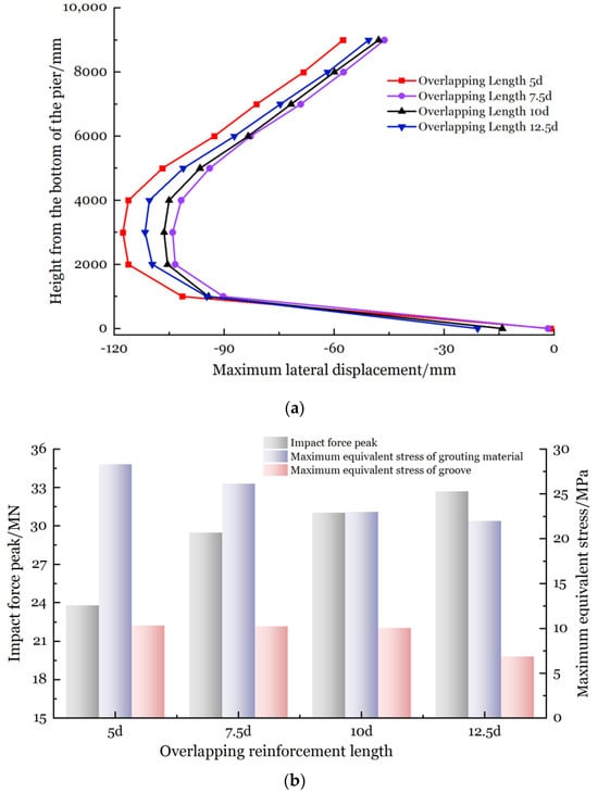 Bridge pier impact response at different overlapping reinforcement lengths. (a) Pier displacement response; (b) pier impact force response.