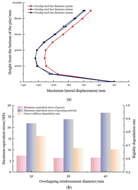 After the collision, some of the overlapping reinforcement in the pier cap footing groove entered the plastic stage, indicating that the overlapping reinforcement fully participated in force transmission and energy dissipation during the pier column’s resistance to impact. Therefore, a parametric analysis was conducted on the diameter of the overlapping reinforcement. Figure 11 compares the impact response of piers with different diameters of overlapping reinforcement under a vehicle speed of 100 km/h. It can be observed from the figure that changes in the diameter of the embedded reinforcement in the pier cap footing enhanced the restraining effect of the pier cap footing on the pier column and the integrity of the assembled column. The increase in local stiffness of the groove and grouting material resulted in greater deformation of the upper pier column. The maximum equivalent stress in the grouting material increased as the diameter of the embedded reinforcement in the pier cap footing increased, while the maximum equivalent stress in the pier cap footing groove decreased accordingly. This indicates that larger- diameter overlapping reinforcement reduced local damage to the concrete in the pier cap footing groove. Therefore, leveraging the high strength and durability of UHPC, appropriately increasing the diameter of the overlapping reinforcement effectively protected the pier cap footing groove. Compared to changing the length of the overlap segment, increasing the diameter of the overlapping reinforcement did not significantly improve impact resistance performance.