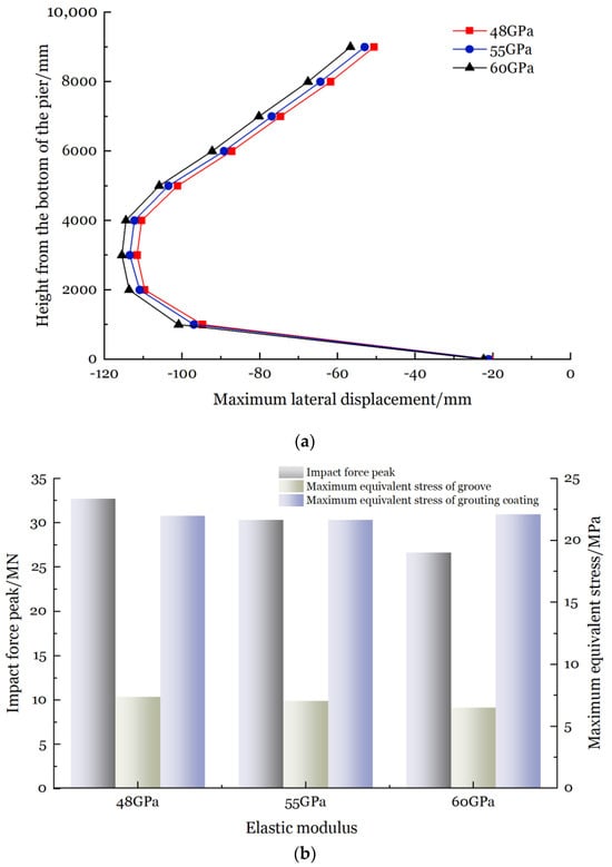 Bridge pier impact response at different grouting material elastic moduli. (a) Displacement response; (b) impact force response.