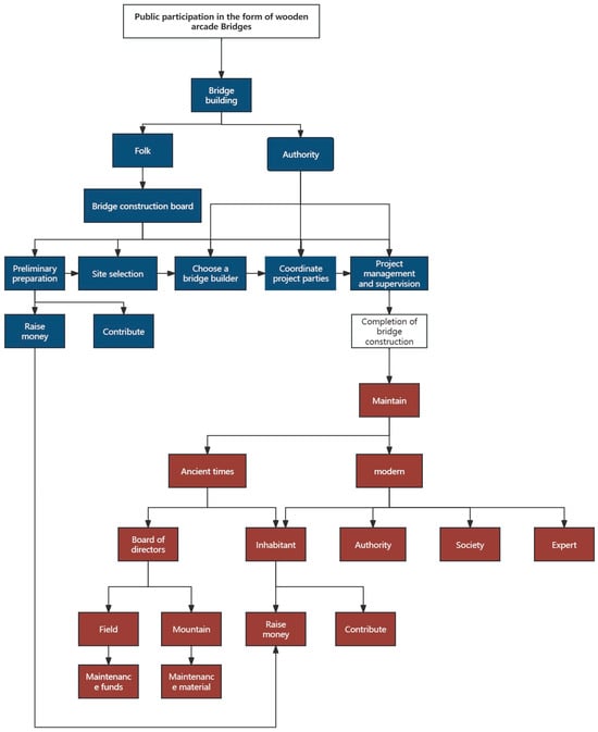 Wooden arcade corridor bridges are a unique form of bridge in China without riveting and with interpenetrating beams to form an arch bridge and houses on the bridge. There are more than 100 ancient wooden arch bridges in existence, mainly concentrated in the northeast of Fujian and southwest of Zhejiang, including Fujian Shouning, Wuyi Mountain, Pingnan and Zhejiang Taishun, Qingyuan, Jingning, and other places. They are not only a means of transportation but also a place for residents to rest, sacrifice, trade, and be entertained, as well as people’s spiritual home and emotional sustenance. According to the related research, the construction type of the ancient wooden arch corridor bridges in Fujian and Zhejiang can be categorized into three types: official-led construction; official and public co-construction, i.e., officially planned and organized, while the public undertakes the specific construction; and public-led construction, which is entirely managed, funded, and organized by the public (usually led by clans or families). The third type of construction has very high community participation [] (Figure 1). Modern new wooden arcade bridges are also gradually appearing, and their construction methods are mostly the third type.