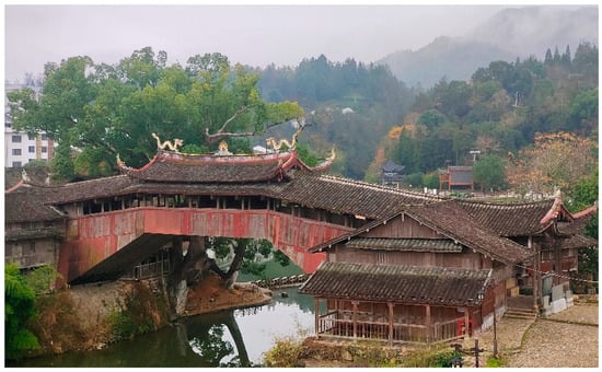 - Chen, X.; Yao, L.; Chen, J.; Lan, S.; Peng, D. Temporal and Spatial Layout and Evolution of Cultural Heritage of Timber Arch Lounge Bridges in Fujian and Zhejiang Provinces. Chin. Landsc. Archit. 2021, 37, 139–144. [Google Scholar]