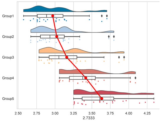 Data collected from surveys and interviews with villagers and the official government data were used to calculate 5-year AHP comprehensive scores for 23 wooden arch corridor bridges (Table 4, Figure 5). The annual index scores of each bridge were added in proportion to obtain an overall score (out of 5). The data of 23 wooden arcade bridges were made into a cloud and rain map by year. The red lines and dots indicate the change in the average from year to year, the diamonds indicate the abnormal points, and the waves indicate the number of covered bridges in this range. The cloud and rain chart in Figure 5 shows that public participation has increased yearly. The results show that the number of occurrences of a high degree of public involvement in protecting wooden arcade bridges is rising, while the phenomenon of a low degree of public participation is decreasing, and the value distribution is more uniform. This indicates a growing interest and involvement from the public in bridge-related activities.