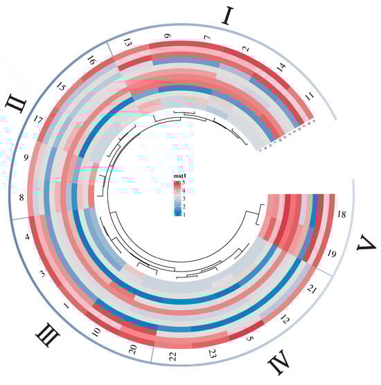 Cluster analysis of the 23 wooden arch corridor bridges based on the average values of each indicator over five years was performed (Figure 6), resulting in classification into five groups. The first group comprises six bridges, while the second, third, and fourth groups each include five bridges, and the fifth group consists solely of “BJ Bridge” and “XD Bridge”.