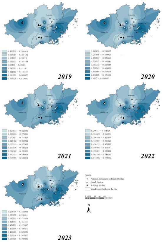 We selected five representative corridor bridges and used the Inverse Distance Weighting (IDW) method in GIS to predict the level of public participation for nearby bridges based on the public participation proximity data (Figure 7). The first group consists of “XD Bridge”, “BJ Bridge”, and “CY Bridge” from Wenzhou City, Taishun County. The second group includes “HS Bridge” from Qingyuan County. The third group comprises “RL Bridge” from Qingyuan County and “LF Bridge” from Shouning County. The fourth group consists of “TD Bridge” from Gutian County. The fifth group includes “YQ Bridge” from Nanping City. This application of GIS analysis allows for the assessment and prediction of public participation levels across different corridor bridges, aiding in understanding the spatial relationships and factors influencing community engagement in heritage protection efforts.