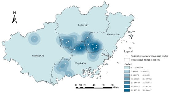 Through categorizing public participation levels and analyzing the relative proximity of wooden arch corridor bridges, it was observed that public participation changes are related to these bridges’ geographical location. Therefore, the distribution of wooden arch corridor bridges was analyzed using a Geographic Information System (GIS) (Figure 4, Figure 8, and Figure 9).