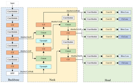 This model relies on CSPNet for feature extraction. CSPNet reduces computational load through cross-stage partial connections, thereby improving the performance in feature representation and efficiency. Additionally, YOLOv8 incorporates a spatial pyramid pooling module into its backbone network. This module is effective in capturing multi-scale spatial information, enabling the model to perform better in terms of detecting objects of different sizes. In the detection head, YOLOv8 integrates PANet, which enhances the fusion of features extracted from different layers, further improving the accuracy of detection. This model features a refined loss function that takes into account localization error, classification error, and confidence error, which significantly improves the accuracy and stability of detection while maintaining its high time efficiency. Moreover, YOLOv8 incorporates flexible and diverse data augmentation strategies, such as Mosaic augmentation, random cropping, and color jittering. These strategies enhance not only the generalization performance of the model, but also the diversity of the training data. With the MS COCO dataset test-dev 2017 as a benchmark, YOLOv8x achieves an impressively high AP of 53.9% when the image has a size of 640 pixels, outperforming YOLOv5. On an NVIDIA A100 equipped with TensorRT, YOLOv8 achieves a fairly high speed of 280 FPS, underscoring its high performance in time efficiency []. The experimental results obtained on multiple public datasets show the potential of YOLOv8 in detecting small objects, multi-scale objects, and objects in complex environments. The structure of YOLOv8 is illustrated in Figure 1.
