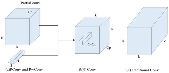In FasterNet, proposed by Jie Ren Chen et al. [] (2023), partial convolution (PConv) is performed to reduce floating-point operations (FLOPs) by efficiently extracting spatial features and minimizing redundant computations and memory accesses. PConv leverages the high similarity of feature maps across different channels by performing convolution operations on a subset of certain channels, with the others kept unchanged. Thus, the computational complexity is reduced. To maintain the continuity of memory, either the starting or ending sequence of consecutive channels is taken to represent the entire feature map. Subsequently, pointwise convolution (PWConv) is incorporated into PConv for the effective use of information from all channels, which generates an effective receptive field on the input feature map similar to T-shaped convolution. This decomposition into PConv and PWConv relies on the redundancy between convolution operations, thus further reducing FLOPs. It is crucial to determine the relationship between memory access and computational complexity. This is because both memory access and computational load can be significantly reduced by minimizing the number of channels involved in convolution.