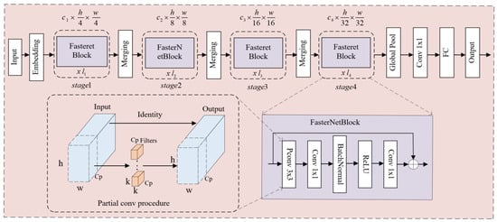 FasterNet is implemented in four stages, each of which involves a group of FasterNetBlocks, with a preceding embedding or merging layer used for spatial downsampling and channel expansion. The overall architecture of FasterNet is shown in Figure 3. The FasterNetBlock consists of a series of convolutional layers, including one PConv layer and two PWConv layers. In the PConv layer, convolution is performed to retain the partial identity of the input; in the PWConv layers ( convolutions), the feature maps are further processed to enhance their representativeness. Through the inclusion of batch normalization and ReLU activation functions after each convolutional layer, convergence and non-linearity are improved.