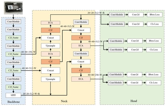 Figure 5 illustrates the structure of the FE-YOLO model. Based on the original architecture of YOLOv8, the C2f modules in the backbone are replaced with Faster_C2f and the ECA attention mechanism is incorporated into the neck section.