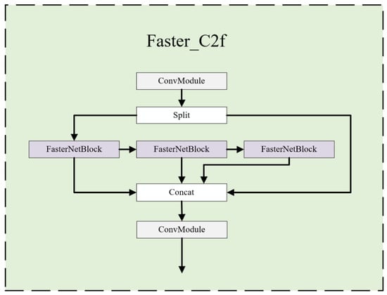 With the incorporation of FasterNet blocks, C2f bottlenecks can be replaced to achieve a comparable or even better performance in feature representation with fewer parameters involved and a reduction in computational load. Moreover, when the C2f structures in the neck of YOLOv8 are replaced with FasterNet blocks, the overall computational efficiency is further enhanced without any compromise on performance. Therefore, this strategic modification enables the model to perform better in the pace of processing and resource utilization, thus improving the efficiency and performance of YOLOv8. As shown in Figure 6, the bottleneck in C2f is replaced with FasterNet blocks, namely, Faster_C2f.
