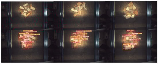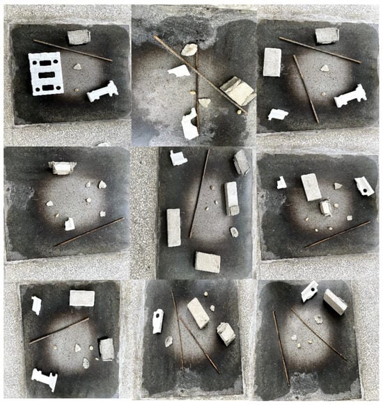 To train and evaluate the proposed construction waste detection model, five representative types of construction wastes were collected from the Recycling Center of Xiangyang City. They included small stones, concrete blocks, rebar, foam, and bricks, as seen in a total of 550 images. The initial resolution of the captured images is 1920 × 1080 pixels in RGB. The sample datasets are shown in Figure 7.