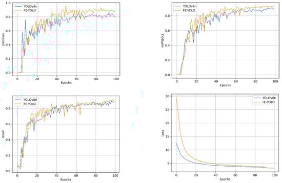 In order to compare YOLOv8n with FE-YOLO during the training process, the training curves of the two models were drawn on the precision, recall, Map@50, and Los training data. Figure 8 summarizes the performance achieved by the YOLOv8n model and the FE-YOLO model during the training process.