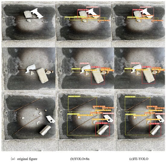 In order to illustrate the outcome of detection, the YOLOv8n and FE-YOLO models were used to detect the construction wastes in the four photos from the test sets, respectively. Figure 9 shows the test results.