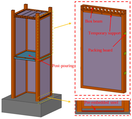 Furthermore, it has been demonstrated that shear walls with CFST boundary elements offer remarkable seismic performance [30]. However, connecting CFST columns to reinforced concrete webs presents new challenges, requiring a complex and labor-intensive process of welding shear keys onto steel tubes and integrating them with the wall panels during casting. Therefore, this research introduces a prefabricated composite shear wall with a CFST frame to overcome these limitations. As illustrated in Figure 1, the design integrates a CFST frame with prefabricated web panels. The prefabricated web panel was composed of a reinforced concrete slab encased in C-shaped steel sections with a top box beam. These steel sections on the sides were welded to square steel tubes to form vertical seams, while those at the bottom of the upper web panel were welded to the top box beams of the lower web panels, forming horizontal seams. Fill plates were mounted on the exterior of the prefabricated web panels to ensure precise spacing between the panels and the steel tubes, which was essential for achieving the correct weld thickness and quality. The lower flanges of the box-shaped beams at the top of the prefabricated web panels were designed to extend beyond the wall surfaces, offering temporary support for the prefabricated floor slabs. Steel tubes were assembled in batches of two to three stories, with concrete poured into the tubes following the installation of the prefabricated web panels. The benefits of this system are as follows: (1) CFST frames enhance seismic performance and reduce the risk of collapse; (2) welded connections require less precision and simpler assembly, thereby improving efficiency; and (3) box beams can be adapted to connect floor slabs, which increases assembly rates.