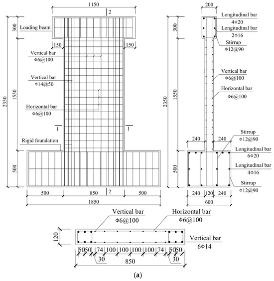 Seven new CRCSW-CFST specimens and one RCSW specimen were designed and fabricated following current standards [31,32]. Figure 2 shows the construction details of the specimens, while Table 1 summarizes the detailed parameters. The specimens were developed to compare the advantages of CRCSW-CFSTs with traditional RCSWs and to evaluate the influence of axial compression ratio, concrete strength, and shear span ratio on the performance of the developed CRCSW-CFSTs. Vertical and horizontal rebars with a diameter of Ø6/100 mm were used to reinforce the concrete webs in all specimens. The steel content in the CRCSW-CFST boundary elements was comparable to that in the RCSW boundary elements. The reinforcement ratios for the RCSW boundary elements were determined using the equivalent strength principle, aligning with the steel quantities used in the CRCSW-CFST boundary elements. Samples with varying shear span ratios showed varying heights. For instance, the CFST-2.0-0.3-C50, CFST-1.5-0.3-C50, and CFST-2.5-0.3-C50 specimens demonstrated heights of around 1550, 1125, and 1975 mm, respectively, while the height of other specimens was determined to be 1550 mm.