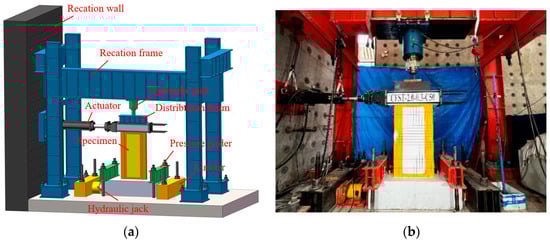The experimental setup for applying axial and cyclic lateral loads is illustrated in Figure 3. A 300-ton jack attached to the reaction frame through a sliding support to accommodate free movement during loading applied the vertical load. A highly rigid distribution beam was placed between the lower end of the jack and the loading beam to ensure uniform application of the vertical load across the specimens. Horizontal load was applied using a 600 kN MTS electro-hydraulic servo actuator, which was fixed to the reaction wall on one end and connected to the loading beam via a high-strength lead screw on the other. Unidirectional hinges at both ends of each actuator ensured the stable application of horizontal loads. The foundation beams of the specimens were anchored to the ground using a pressure beam and anchor bolts, with a horizontal jack placed between the foundation beam and the limit blocks to prevent sliding.