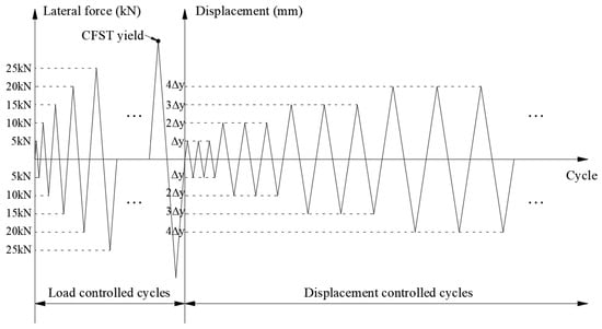 After applying the vertical load, a horizontal load was introduced to the specimen. According to the standards [38], the horizontal load was applied in two stages: force control and displacement control, as shown in Figure 4 [39]. The force control stage commenced with an initial load of 0 kN, which was gradually increased by 5 kN increments. Each increment was applied once and cycled at a rate of 5 kN/s until either the RCSW demonstrated cracking or the steel pipe in the CRCSW-CFST yielded. In the displacement control stage, the amplitude was adjusted to the maximum displacement observed in the previous stage. Each displacement level was cycled thrice at a rate of 1 mm/s until the specimen load capacity dropped below 85% of the peak load, at which point the specimen was considered to have reached failure [40].