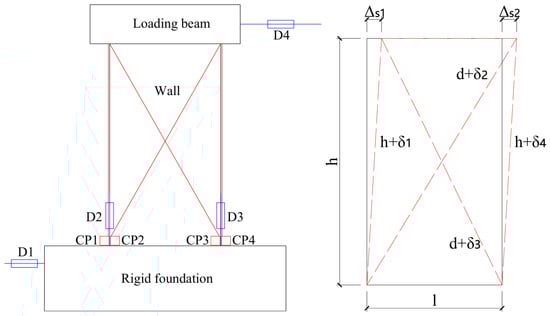 The measurement setup comprised dial gauges (D1–D4) and wire displacement transducers (CP1–CP4), as illustrated in Figure 5. D1–D3 were used to detect lateral movement or uplift of the rigid foundation, while D4 measured the horizontal displacement of the loading beam. CP1 and CP4, placed on the exterior sides of the shear wall, recorded vertical deformations, and CP2 and CP3, positioned diagonally across the wall, measured diagonal deformations. The bending deformation was calculated using Equation (2), while the shear deformation was determined by Equation (3) [41].
