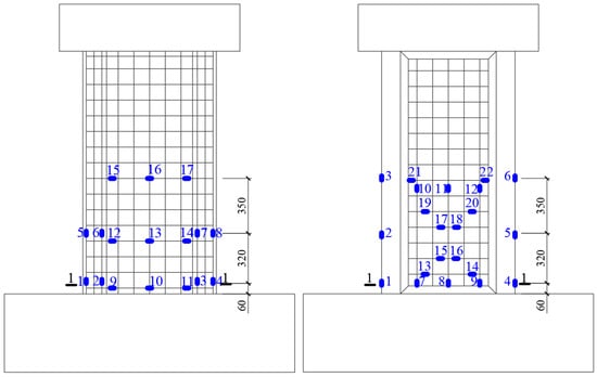 Strain gauges were installed on the specimens to measure the strain in the steel sections and reinforcement bars. Their locations and quantities are depicted in Figure 6.