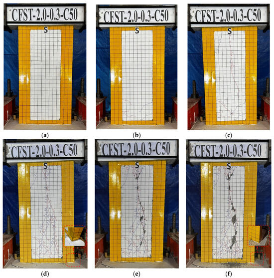 Failure process and crack distribution of specimen CFST-2.0-0.3-C50. (a) Initial, (b) Δ = 12 mm, (c) Δ = 15 mm, (d) Δ = 31.5 mm, (e) Δ = 35 mm, (f) Δ = 39 mm.