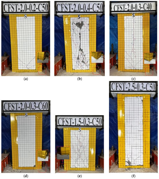 Failure modes of specimens under maximum loading displacement. (a) CFST-2.0-0.2-C50 (Δ = 36 mm); (b) CFST-2.0-0.4-C50 (Δ = 35 mm); (c) CFST-2.0-0.3-C40 (Δ = 31.5 mm); (d) CFST-2.0-0.3-C60 (Δ = 48 mm); (e) CFST-1.5-0.3-C50 (Δ = 28 mm); (f) CFST-2.5-0.3-C50 (Δ = 32 mm).